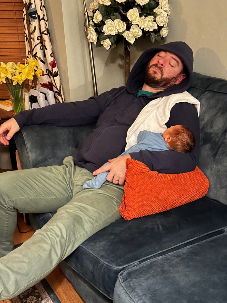 Sleepless nights are inevitable with a newborn, but the love hormone oxytocin helps our minds and bodies push through. (And before you come for us for sleeping unsafely, I’m right there with the camera, baby was not at risk!)